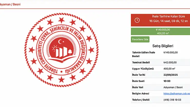 İhaleyle satışa çıkarılan arazinin ihale tarihi 22 Eylül 2025 Pazartesi günü saat 10:00 olarak açıklandı. İhale yeri ise Adıyaman/Besni olarak belirtildi. İhaleye katılmak isteyenlerin yatırması gereken teminat bedeli ise 42 bin TL.