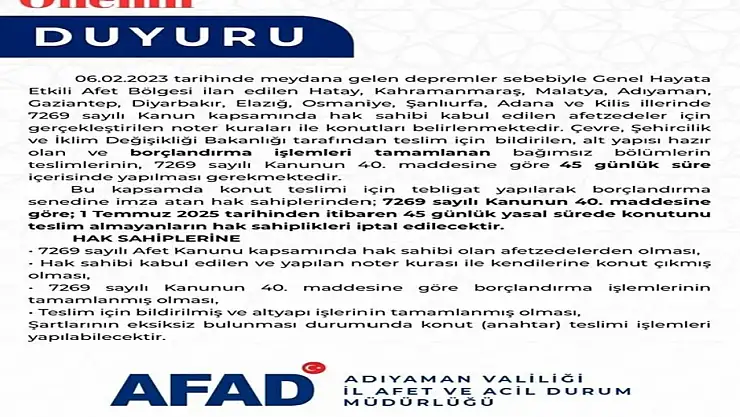 Konuyla ilgili Adıyaman Valiliği tarafından yapılan önemli Duyuruda şu ifadelere yer verildi; “06.02.2023 tarihinde meydana gelen depremler sebebiyle Genel Hayata Etkili Afet Bölgesi ilan edilen Hatay, Kahramanmaraş, Malatya, Adıyaman, Gaziantep, Diyarbakır, Elazığ, Osmaniye, Şanlıurfa, Adana ve Kilis illerinde 7269 sayılı Kanun kapsamında hak sahibi kabul edilen afetzedeler için. Gerçekleştirilen noter kuraları ile konutları belirlenmektedir. Çevre, Şehircilik ve İklim Değişikliği Bakanlığı tarafından teslim için bildirilen, alt yapısı hazır olan ve borçlandırma işlemleri tamamlanan bağımsız bölümlerin teslimlerinin, 7269 sayılı Kanunun 40. maddesine göre 45 günlük süre içerisinde yapılması gerekmektedir. Bu kapsamda konut teslimi için tebligat yapılarak borçlandırma senedine imza atan hak sahiplerinden; 7269 sayılı Kanunun 40. maddesine göre; 1 Temmuz 2025 tarihinden itibaren 45 günlük yasal sürede konutunu teslim almayanların hak sahiplikleri iptal edilecektir.