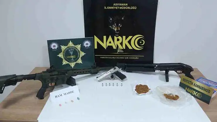 Kahta ilçesinde Cumhuriyet ve Gazi Mahallesinde 2 ayrı adreste arama gerçekleştirildi. B.H.Ç, S.N.S, E.A ve M.S. isimli şahısların gözaltına alındığı arama 1.98 gram sentetik kannobinoid hammaddesi, 54.76 gram sentetik kannobinoid maddesi, 1 adet kuru sıkı tabanca ve 2 adet pompalı tüfek, 1 adet şarjör ele geçirildi.