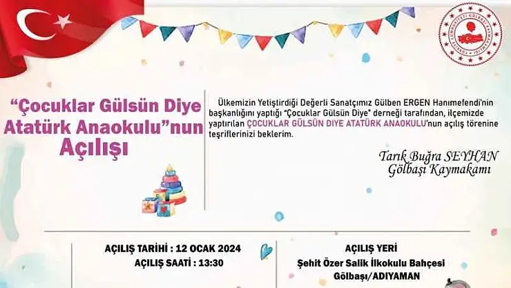 Gölbaşı ilçesine yeni bir anaokulu kazandıracak olmanın sevincini yaşadıklarını ifade eden Gölbaşı Kaymakamı Tarık Buğra Seyhan; “Ülkemizin yetiştirdiği değerli sanatçımız Gülben Ergen hanımefedi’nin başkanlığını yaptığı ‘Çocuklar Gülsün Diye’ derneği tarafından ilçemizde yaptırılan Çocuklar Gülsün Diye Atatürk Anaokulunun açılış törenine tüm halkımızı bekliyoruz.” Dedi.
