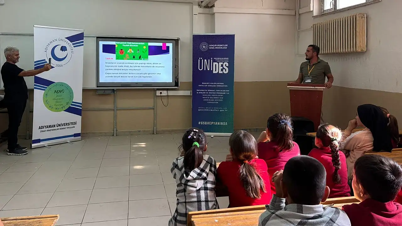 Adıyaman Üniversitesi Ziraat Araştırmaları Öğrenci Topluluğu tarafından yürütülen "Tarımın sessiz kahramanları: Sevimli böcekler ve sevimli mikroplar" adlı ÜNİDES Projesi, Gerger Güzelsu Ortaokulunda gerçekleştirildi.