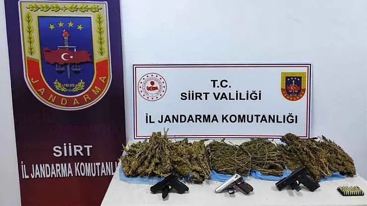 Siirt İl Jandarma Komutanlığı ekiplerince, M.N.Y. isimli şüphelinin Şirvan ilçesinde bulunan ikametinde icra edilen arama sonucunda; 5 kilogram kubar esrar, 50 gram kenevir tohumu, 3 adet ruhsatsız tabanca, 3 adet tabanca şarjörü, 50 adet tabanca fişeği ele geçirildi.