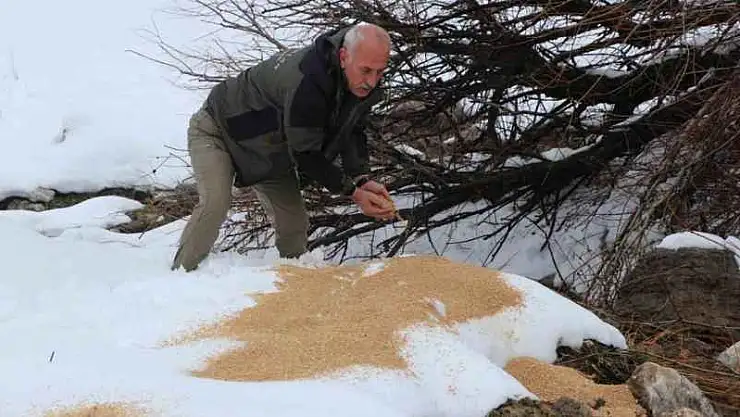 Siirt Valiliği Doğa Koruma ve Milli Parklar Şube Müdürlüğü ekipleri, kar yağışı sonrası yiyecek bulmakta zorluk çeken yaban hayvanları için Şirvan ilçesinde dağlık alanında yaklaşık 10 santimi bulan karlı zemine yem bıraktı.