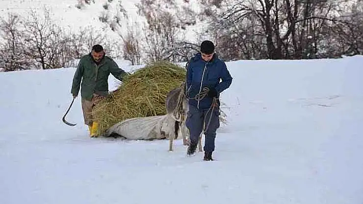 Şırnak'ın Beytüşşebap ilçesinde besici, zorlu kış şartlarında hayvanlarını kızak yardımıyla taşıdığı saman balyalarıyla besliyor.