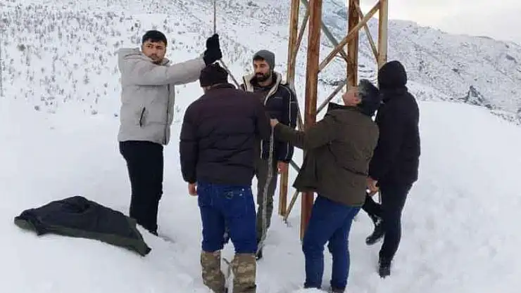 Şırnak'ta kar yağışı sonrası elektrik telleri kopunca, onarıma giden Dicle Elektrik arıza onarım ekibine köylüler de imkanlar dahilinde yardım etti.