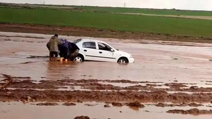 Siverek'te sele kapılan otomobil kepçe yardımıyla kurtarıldı