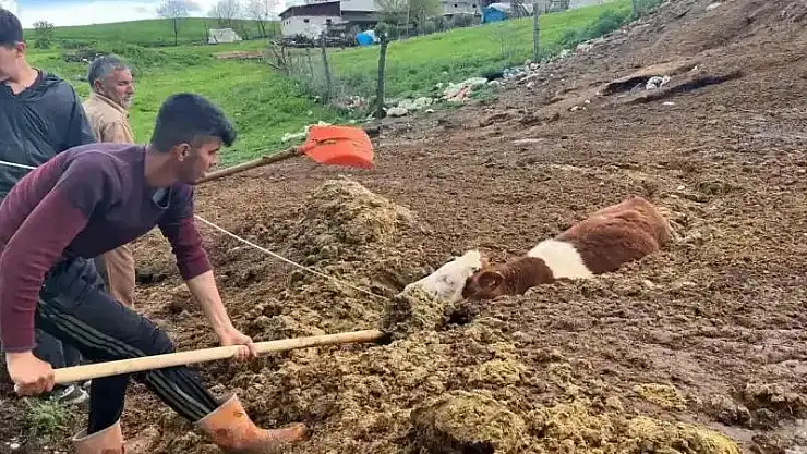 Tezek yığınına batan inek yavrusu saatler sonra kurtarıldı