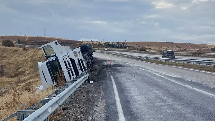 Adıyaman'ın Gölbaşı ilçesinde bir tır kayganlaşan yolda devrildi.