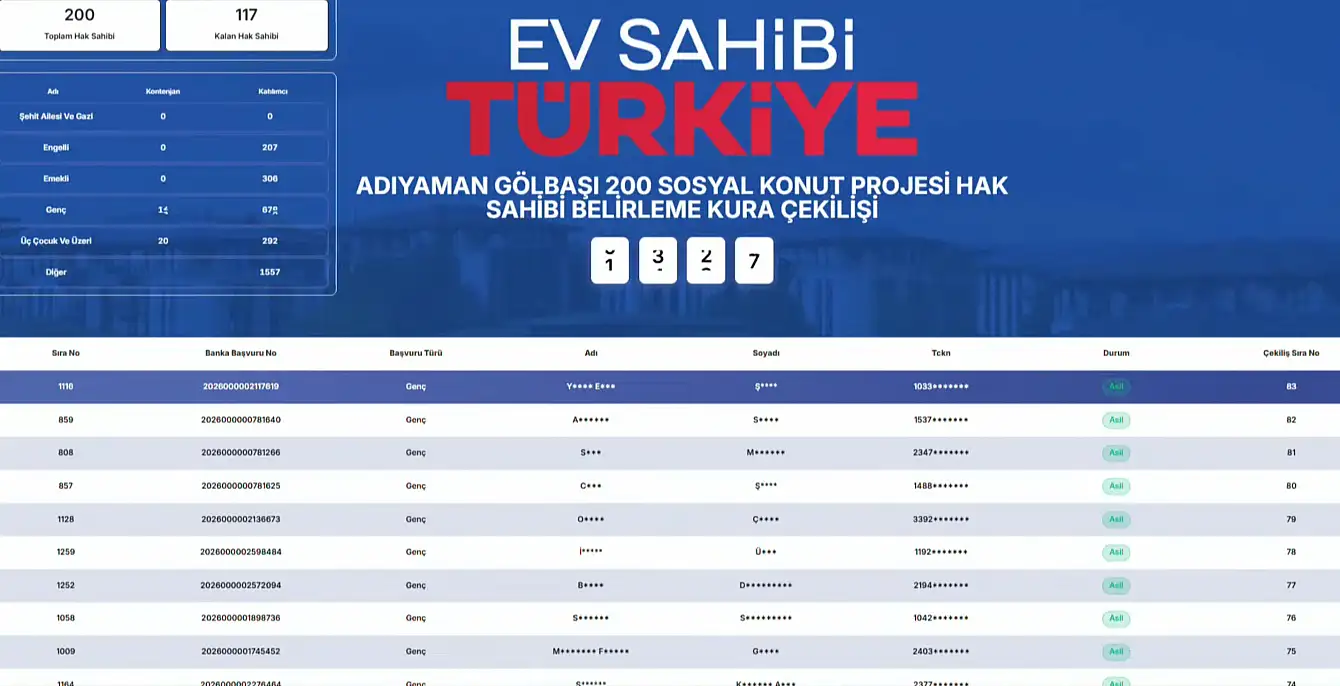 TOKİ Adıyaman Gölbaşı 200 sosyal konut kura sonuçları