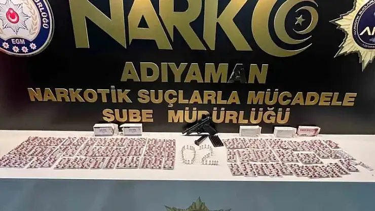 Edinilen bilgilere göre, Narkotik Suçlarla Mücadele Şube Müdürlüğü ekiplerince kent merkezinde uyuşturucuyla mücadele çalışmaları çerçevesinde M.S., isimli şahsı durdurdu. Şahsın yapılan üst aramasında bin 110 adet sentetik ecza hap, 1,32 gram sentetik kannabinoid ve 1 adet tabanca ele geçirildi. Gözaltına alınan şahıs, emniyette tamamlanan işlemlerin ardından Adıyaman Adliyesi’ne sevk edildi. Burada mahkemeye çıkarılan şahıs tutuklanarak cezaevine gönderildi.