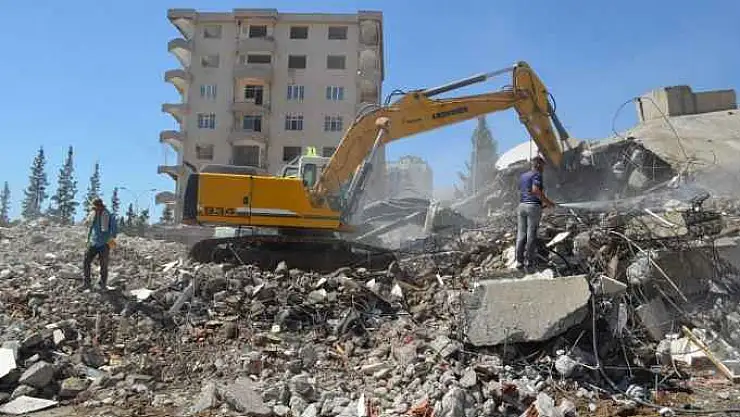 Kahramanmaraş'ta ağır hasarlı bina yıkım çalışması sırasında iş makinesi enkaz altında kaldı. İş makinesi operatörü ise kazayı yara almadan atlattı.
